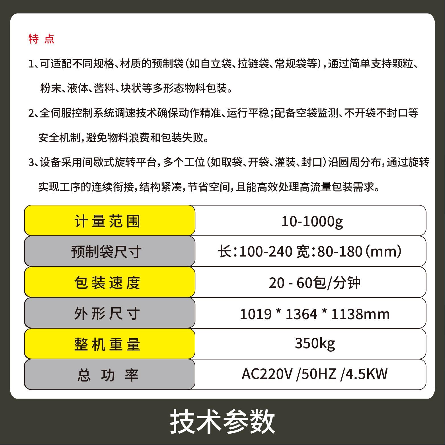 3、設(shè)備采用間歇式旋轉(zhuǎn)平臺,多個工位(如取袋、開袋、灌裝、封口)沿圓周分布,通過旋轉(zhuǎn)實現(xiàn)工序的連續(xù)銜接,結(jié)構(gòu)緊湊,節(jié)省空間,且能高效處理高流量包裝需求。