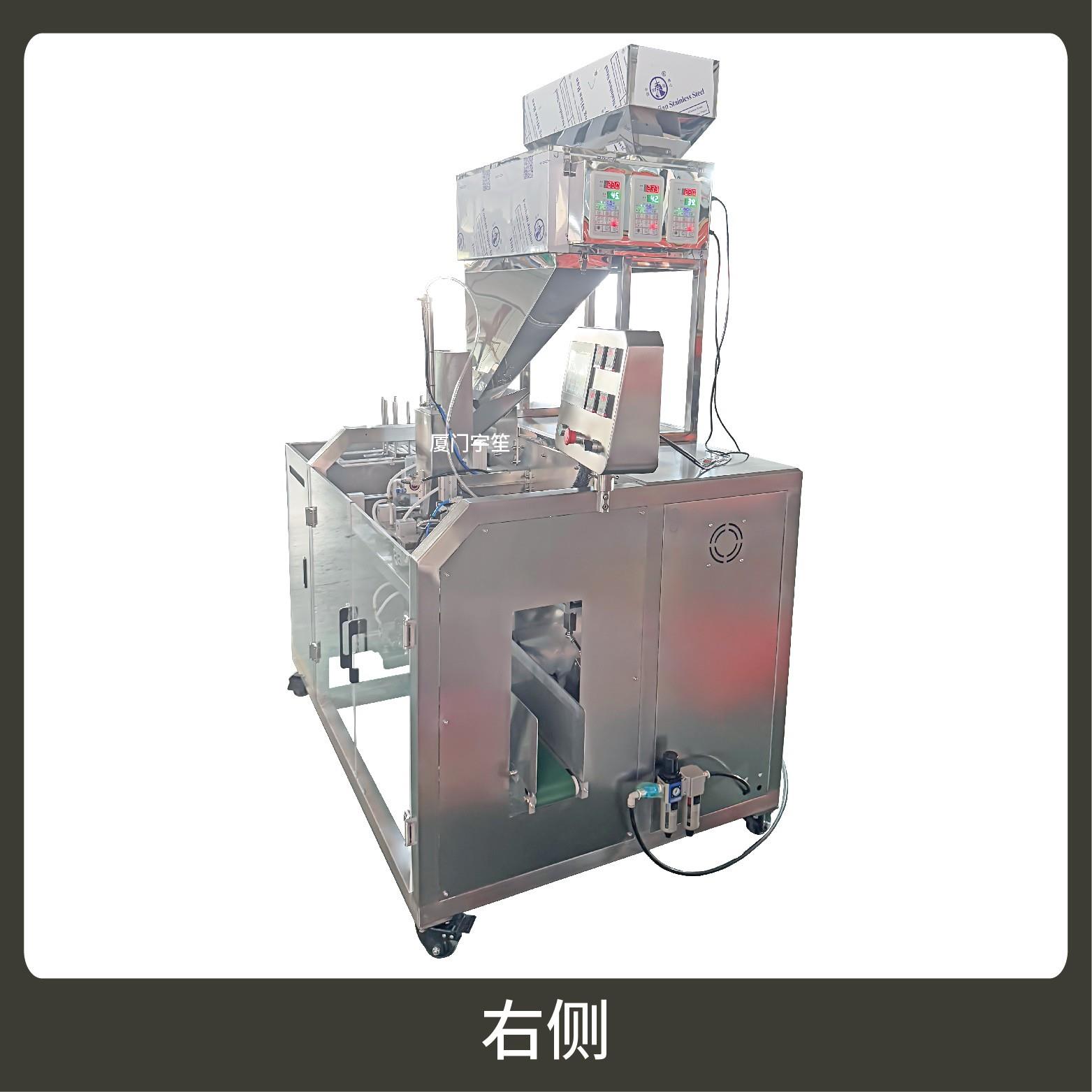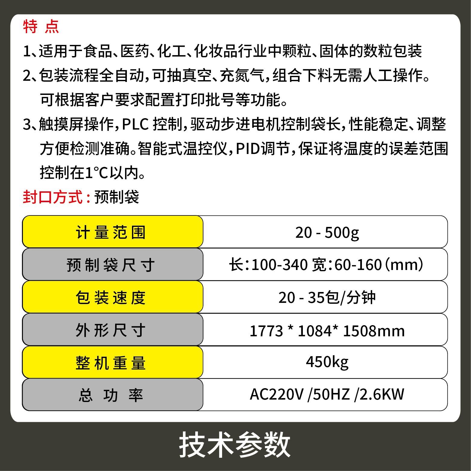 2、包裝流程全自動,無需人工操作,可抽真空、充氮氣,組合下料??筛鶕?jù)充填物料的性質選配不同的下料結構,且可根據(jù)客戶要求配置打印批號等功能。