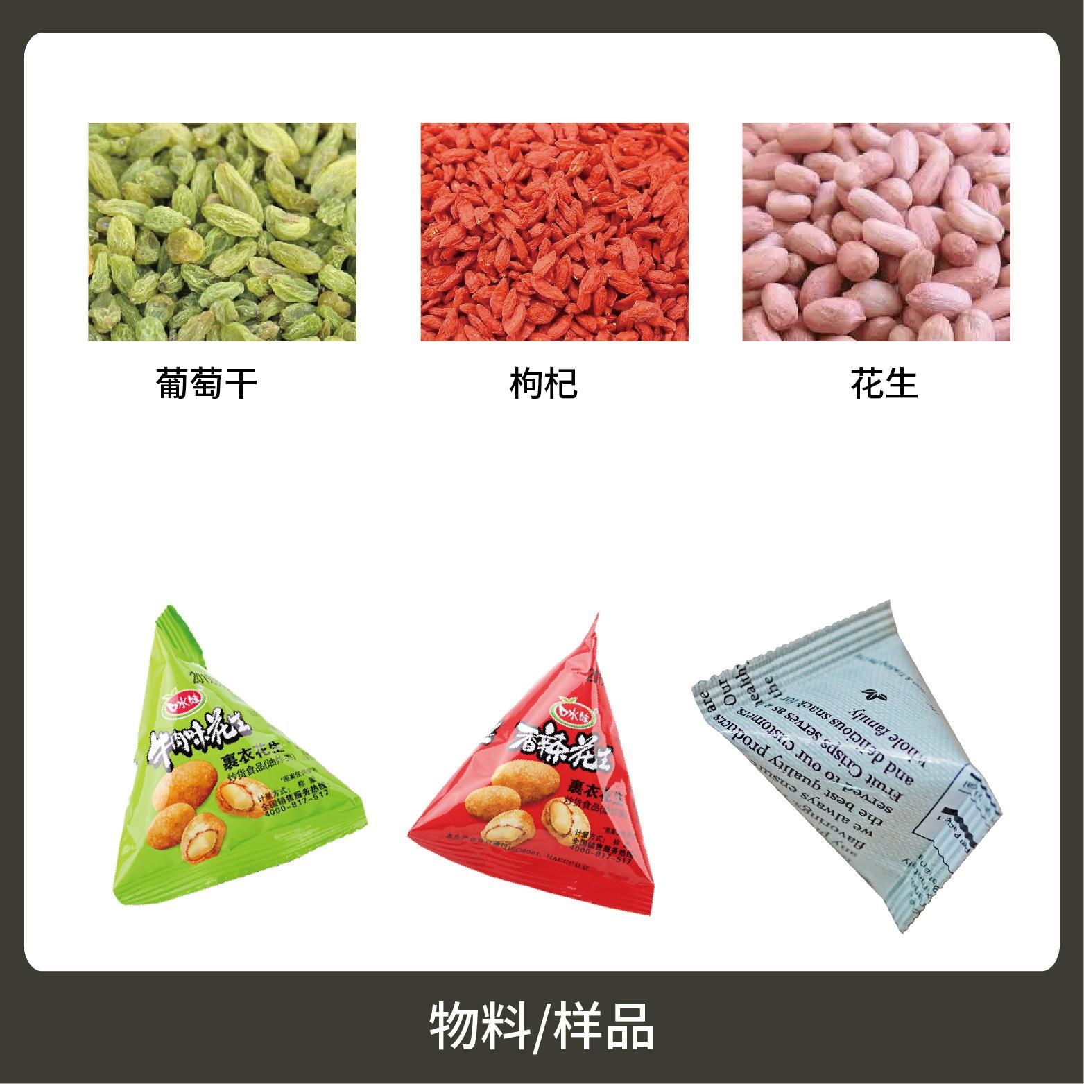 1、適用于食品、醫(yī)藥、化工、化妝品行業(yè)中顆粒物品的計(jì)量包裝,如:尖角脆、巧克力豆、qq糖等。